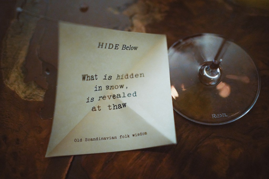 The evening of networking (oh how we’ve missed you!) began at in the cosy concave basement Hide Below of Hide restaurant in Mayfair. Our introduction to Nuet Dry Aquavit was served as a refreshing spritz – the perfect icebreaker to ease us comfortably into our social setting, which got us introducing ourselves – a return of our gracious social skills, before lockdown reduced us to Zoom. Each spritz arrived with a note of old Scandinavian folk wisdom – a personal touch to fit the theme. Mine read, “One must howl with the wolves one is among“… and that, after a long and isolating lockdown, I intended to do.
