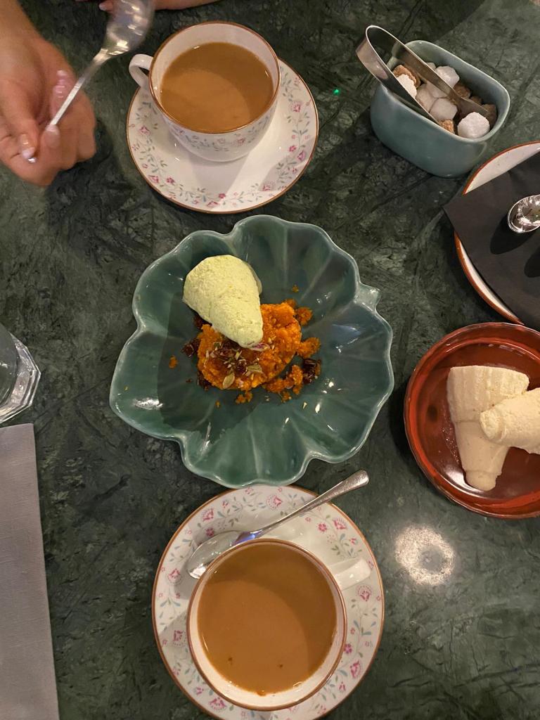 For the main course, Lamb Seekh Kebab is an ace choice for meat lovers – the skewered kebabs are flavoured with spices as well as coriander, and the lamb is roasted to a point that it is still succulent. The Bazaar ke Chole, which is a type of chickpea curry cooked with a spice mix and crushed pomegranates, ascertains a balance between the sweetness of the dried fruit and the aromatic flavours of the homemade spice mix. Saffron Berry Pulao, a type of basmati rice infused with berry and turmeric, is perfect to have as a side since it complements the sumptuous mains. After a hearty meal, have a cup of warm creamy chai and Gajar Pistachio Crumble which are perfect as a post-dinner treat.